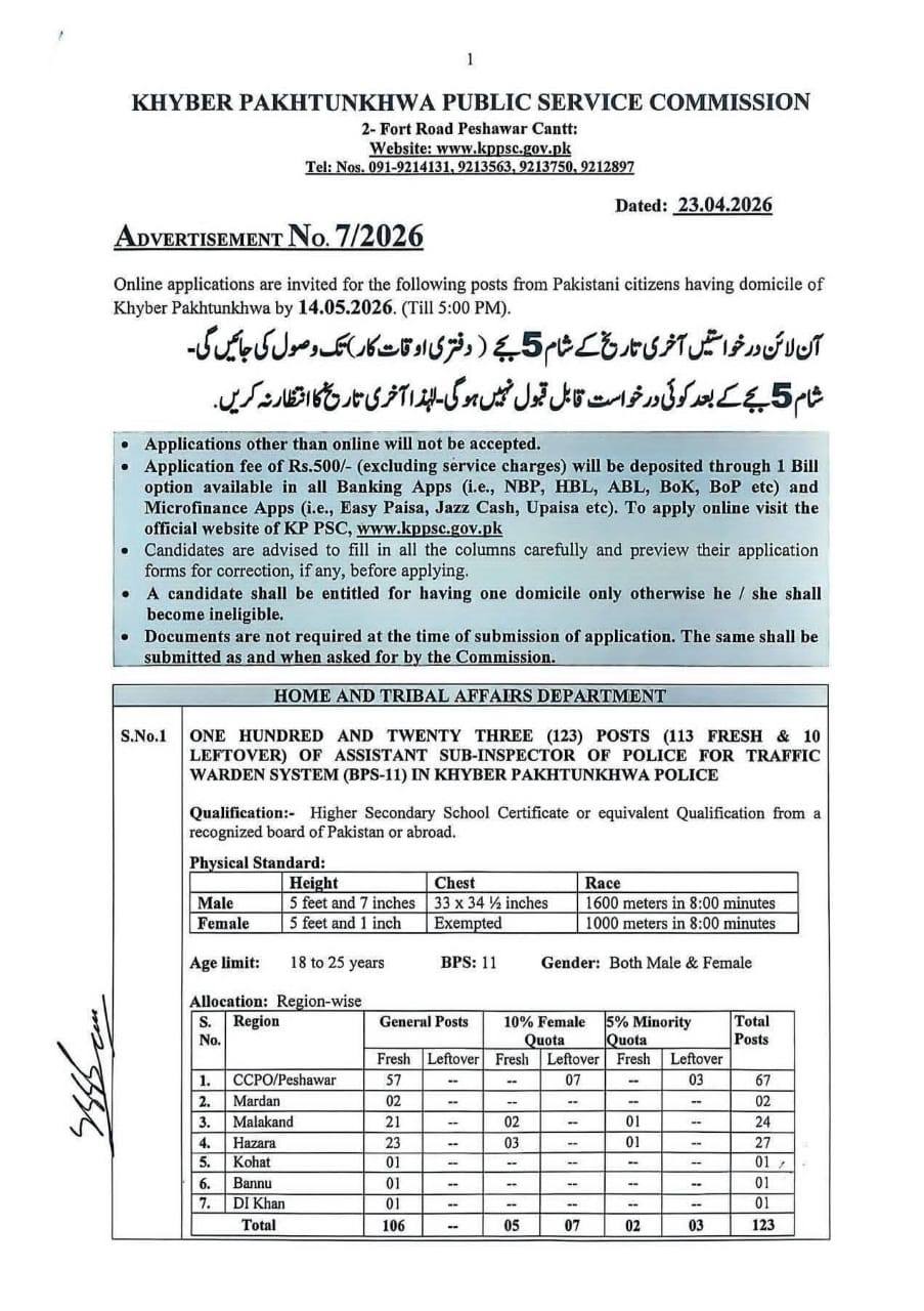 خیبر پختونخوا پولیس میں اے ایس آئی (میل / فی میل) کی بھرتیاں –